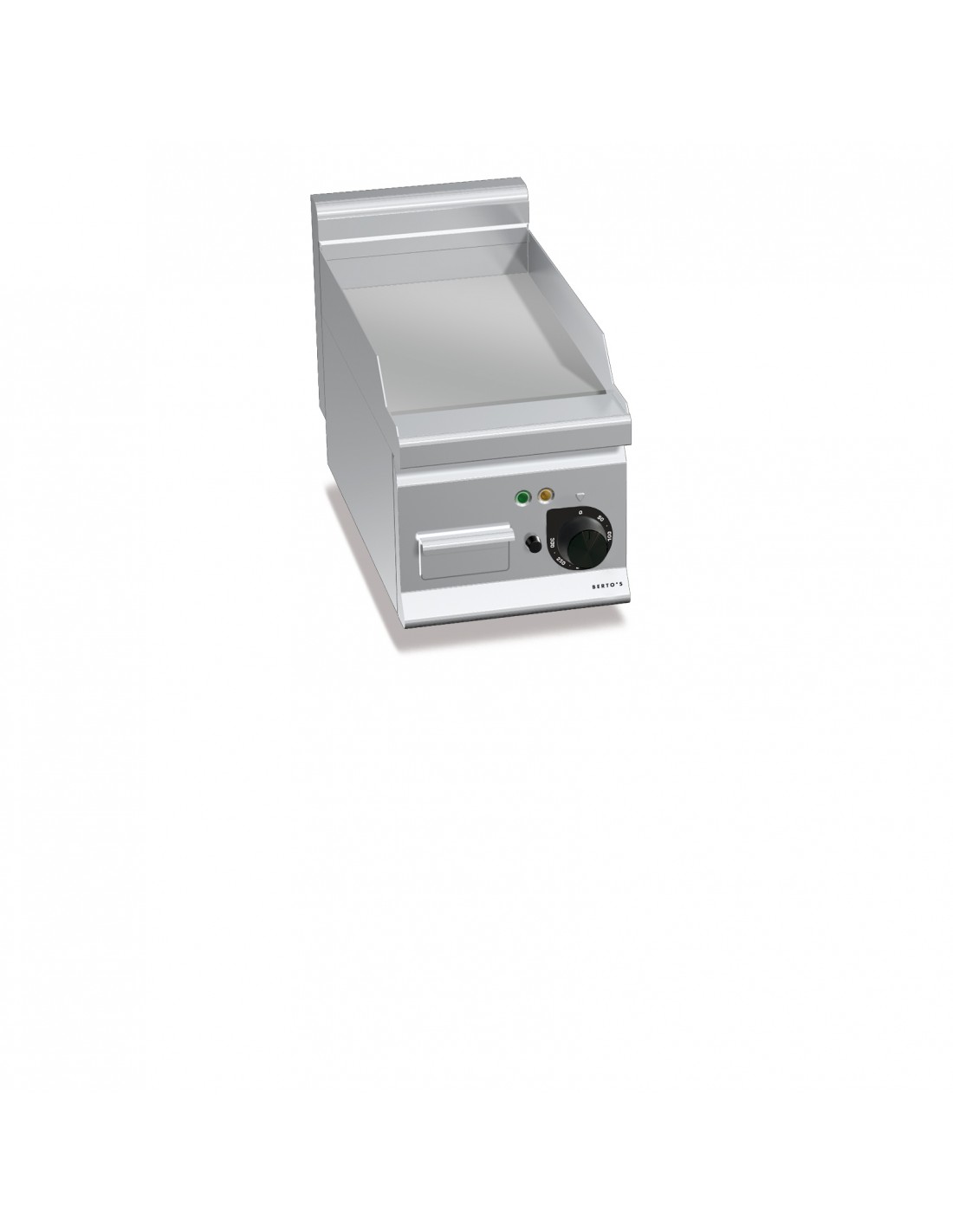- Plancha lisa de acero satinado con protección antisalpicaduras en el borde